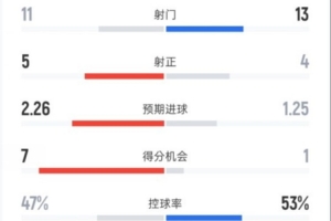 截至目前,纽卡2-2切尔西全场数据:射门11-13,射正5-4,控球率47%-53%的相关情况大致如此,后续仍需关注进一步消息。