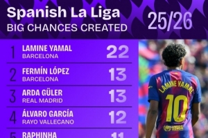 本季西甲创造机会数最多球员:亚马尔22次第一,费尔明&拉菲在列的整体进展暂时整理到这里,后续仍有变化空间。