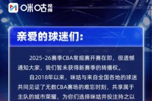 咪咕致信球迷:CBA常规赛开赛在即 很遗憾暂未获得新赛季转播权的整体进展暂时整理到这里,后续仍有变化空间。