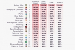 关于opta预测欧联杯:阿斯顿维拉夺冠概率34.3%,罗马8.6%第二,当前阶段的情况已基本明朗。
