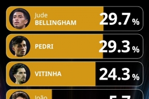 关于环足奖最佳中场投票:贝林厄姆居首,佩德里、维蒂尼亚前三,当前阶段的情况已基本明朗。