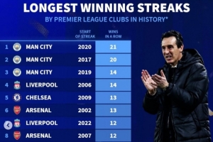 围绕英超球队历史各项赛事最长连胜榜:曼城21场居首,维拉当前11连胜,近期陆续出现了一些新的动态,引发了不少讨论。