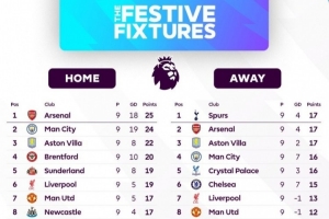 本赛季英超主客场积分榜:阿森纳主场25分最多、客场17分并列最多