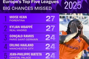 2025年五大联赛错失重大机会次数榜:
