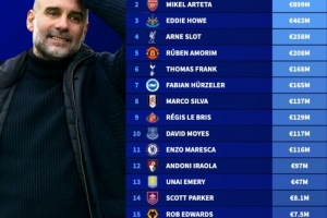 体育资讯1月1日讯 切尔西主帅马雷斯卡在新年当天离任,德国转会市场盘点了英超主帅引援净投入排行,瓜迪奥拉10.3亿欧居首,马雷斯卡1.16亿欧位居第11位。