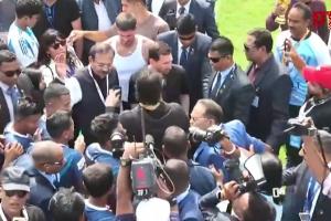 上午11时35分许,梅西与队友们在挤得水泄不通的观众欢呼声中踏入球场。这位阿根廷球星与队友们原计划进行绕场致意,但此环节因政府官员及其随行人员围拢梅西要求自拍合影而被迫中断。