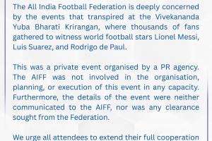 全印度足球联合会对发生体育场的事件深表关切。数万名球迷聚集于此,一睹利梅西、路易斯・苏亚雷斯以及罗德里戈・德保罗等世界足坛球星的风采。