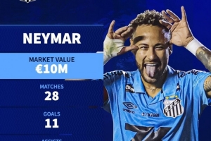 德国转会市场统计了内马尔回归桑托斯以来的数据,他出战28场比赛,打进11球,助攻4次,场均参与0.54球。