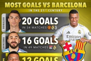 体育资讯1月10日讯 北京时间1月12日凌晨,皇马将在西超杯决赛中对阵巴萨。Score90统计了本世纪球员对阵巴萨的进球数量,C罗、本泽马、姆巴佩排名前三。