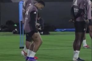 赛前的一段训练视频中可以看到,姆巴佩在训练时谨慎地弯腿测试自己的膝盖情况,可以看出,他尚未恢复到100%的状态。