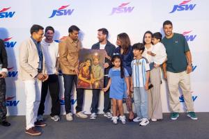 梅西、德保罗和苏亚雷斯参加活动,Sangita Jindal晒出照片,梅西获赠自己和安东内拉身着印度传统服饰的画像。