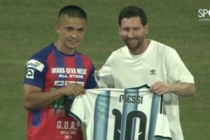 梅西与印度传奇球星切特里一起举着梅西10号球衣合影。