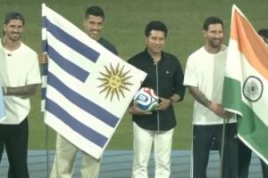 活动中,德保罗手持阿根廷国旗,苏亚雷斯手持乌拉圭国旗,梅西手持印度国旗,三人与现场嘉宾一同合影留念。