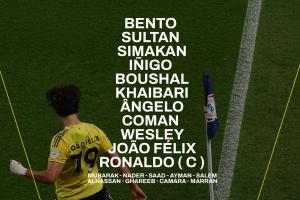利雅得胜利首发:24-本托、3-西马坎、26-伊尼戈、12-纳瓦夫、2-哈纳姆、20-安吉洛、17-哈巴利、21-科曼、80-韦斯利、79-菲利克斯、7-C罗