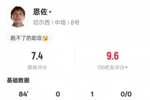 体育资讯1月18日讯 2025-26赛季英超联赛第22轮,切尔西主场迎战布伦特福德。恩佐首发出战,送出1次助攻,还有2次过人成功和3次关键传球,评分7.4。