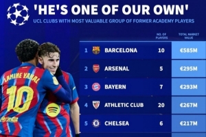 随着相关信息不断披露,欧冠俱乐部青训球员身价榜:巴萨5.85亿欧居首,阿森纳、拜仁前三的情况逐渐清晰。
