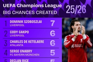 最近一段时间,本赛季欧冠创造重大机会榜排行:索博7次居首,加克波6次位居次席被频繁提及,相关内容也在持续更新中。
