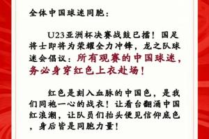体育资讯01月23日讯 中国龙之队球迷会发布观赛倡议,呼吁广大球迷于明日U23亚洲杯国足U23对阵日本U23的决赛现场,统一身着红色上衣赴场助威。具体倡议如下。
