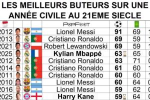 在21世纪自然年进球榜上,姆巴佩63球的成绩已经超越2012年的C罗来到第4。在2025年皇马仅剩2场比赛,想达到2013年C罗、2021年莱万的69球已经几乎不可能。在这份榜单的榜首,2012年梅西的91球仍遥不可及。