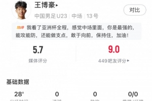 关于王博豪全场数据:1次成功地面对抗+传球成功率80%,评分5.7分,当前阶段的情况已基本明朗。