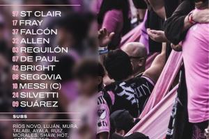 迈阿密国际首发阵容:97-圣克莱尔、17-伊恩·弗雷、37-法尔肯、32-阿伦、3-雷吉隆、7-德保罗、42-布莱特、8-塞戈维亚、10-梅西、24-西尔维蒂、9-苏亚雷斯