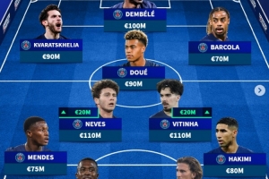 前锋:克瓦拉茨赫利亚(巴黎圣日耳曼,9000万)、奥斯曼·登贝莱(巴黎圣日耳曼,1亿)、巴尔科拉(巴黎圣日耳曼,7000万)