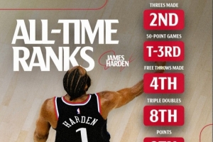 体育资讯1月25日讯 今天,快船官方晒出哈登生涯各项数据的历史排名,详情如下: