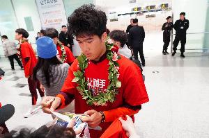 U23国足球员们身穿特制T恤抵达,在机场为球迷签名并接受了采访,T恤上印着“让对手忌惮未来”的口号。