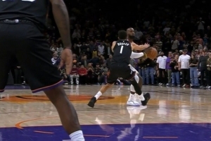 经教练挑战后回看复核,判定对布克的三分犯规吹罚无误。布克在詹姆斯做出向上投篮动作时,主动接触其右臂/手腕部位。