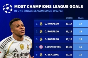 关于欧冠改制以来单赛季进球榜:C罗17球居首,本赛季姆巴佩13球上榜,当前阶段的情况已基本明朗。