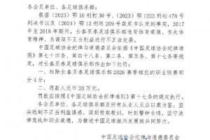 一、扣除长春亚泰足球俱乐部2026赛季相应的职业联赛积分4分: