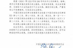 体育资讯01月29日讯 足协发布“假赌黑”处罚结果,原河北华夏幸福足球俱乐部主教练谢峰,违背体育道德、丧失体育精神、为谋取不正当利益进行不正当交易;操控足球比赛,严重违背公平竞赛精神,引起恶劣社会影响,被终身禁赛。