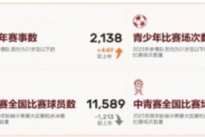 2025年精英青少年球员数109220人,较上年增加16241人,其中男足80245人(较上年增加12846人),女足28975人(较上年增加3395人)。2025年青少年赛事数2138项,青少年比赛场次66615场,青少年球队数18403队。