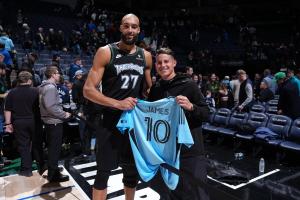 J罗现场观战森林狼与鹈鹕的比赛,赛后与森林狼球星戈贝尔互动寒暄。