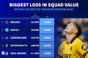 体育资讯2月10日讯 各大联赛冬季转会窗基本都已关闭,《转会市场》也统计了经历这个冬窗之后的球队身价下跌最多情况,狼队居首。