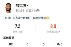 体育资讯2月15日讯 足总杯第四轮,利物浦3-0布莱顿。此役加克波首发89分钟,球员全场重点数据如下↓