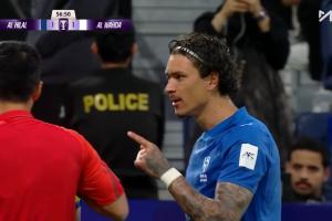比赛第57分钟,新月球员与对手拼抢,随后阿布扎比获得边线球权。努涅斯对着马宁鼓掌,马宁向其出示黄牌。随后努涅斯指着马宁说着什么。