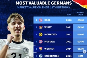 现阶段德国18岁球员身价榜:卡尔居首,维尔茨、穆科科、穆西亚拉列前四的相关动态如上,后续发展值得持续关注。
