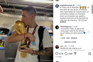 体育资讯12月19日讯 迪马利亚更新Instagram,纪念阿根廷世界杯夺冠三周年。